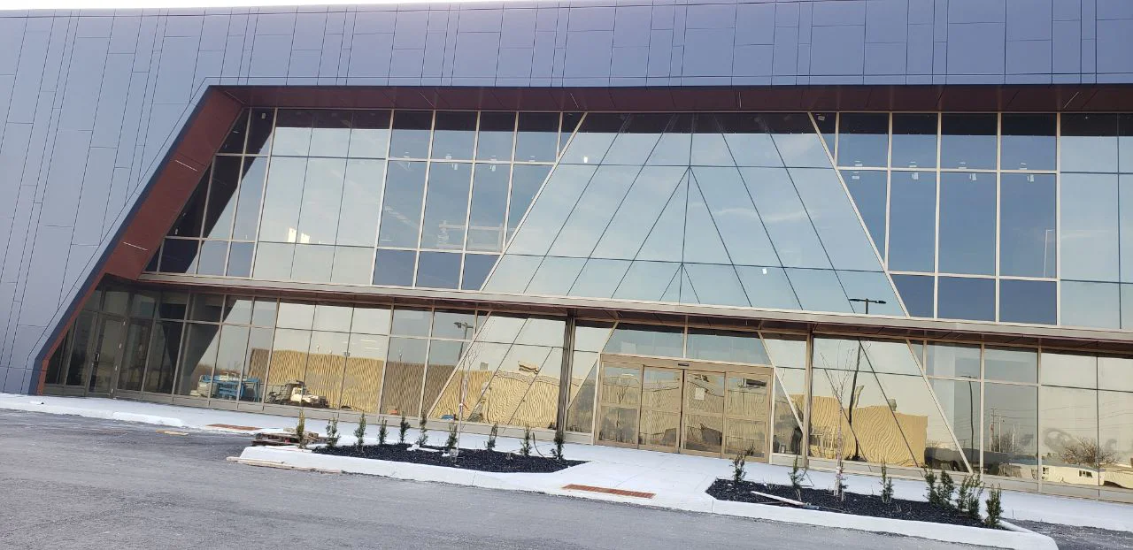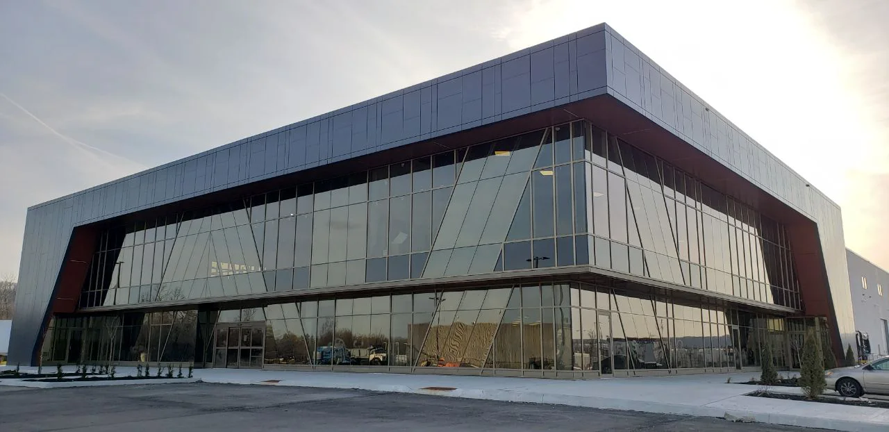 This Autolinx Express Inc. facility in Milton, ON, features a striking silver Aluminum Composite Panel (ACM) cladding façade with deep-set window accents. BuildSky provided a full commercial cladding solution—including 3D façade design, premium ACM panel supply, precision fabrication, and expert installation—resulting in a modern, durable exterior that enhances brand presence along Market Drive.