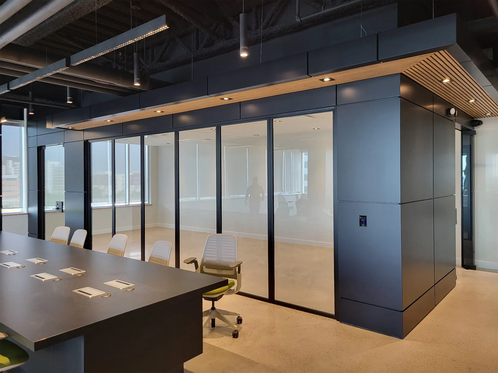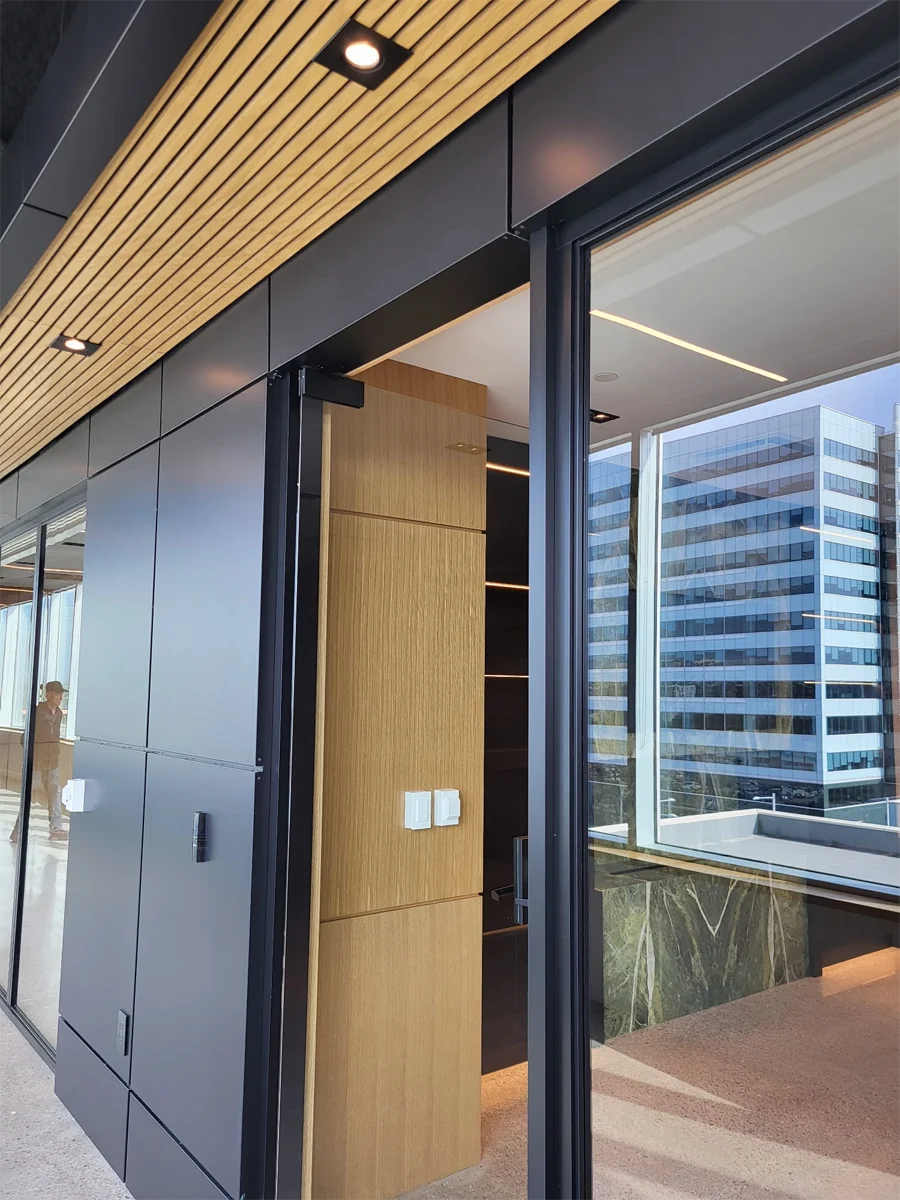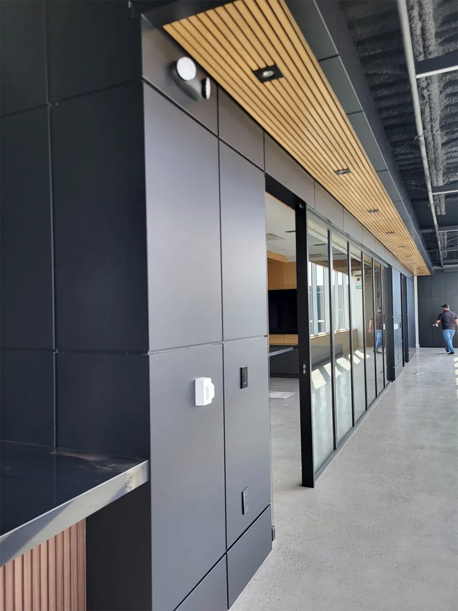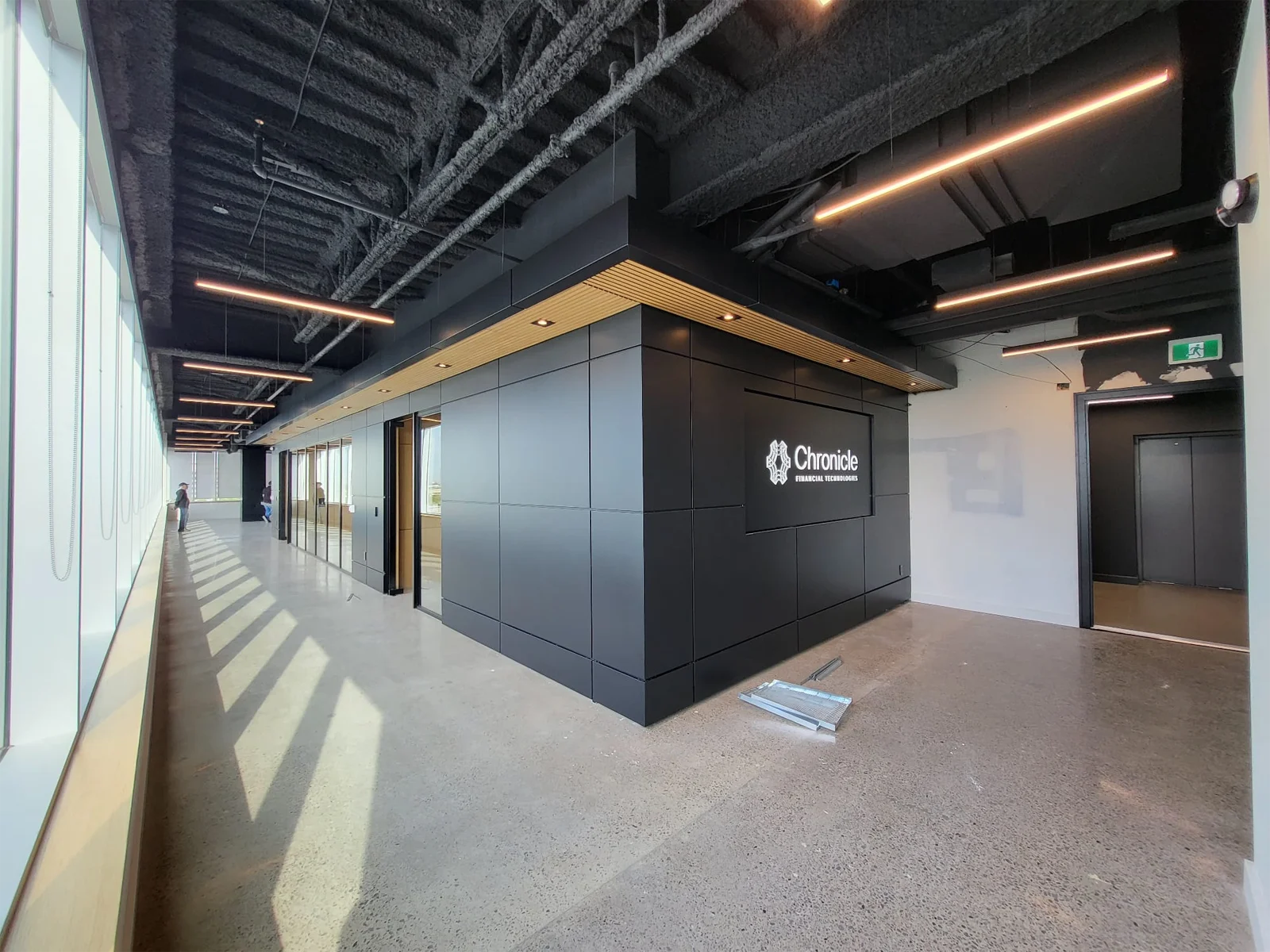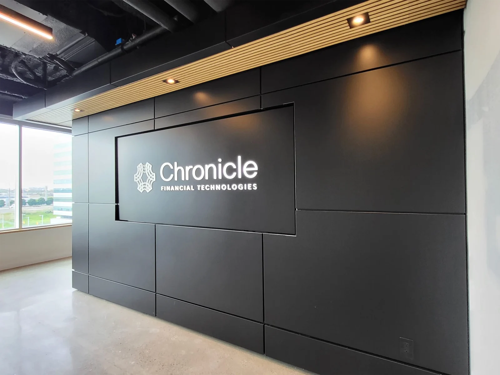 For Chronicle Financial’s corporate headquarters, BuildSky crafted a unified design language across exterior and interior surfaces. The Aluflex ACM panels provide a durable, weather-resistant frame around the building’s façade, while the warm wood-composite soffit adds texture and visual interest beneath the canopy. Inside, a feature wall in black ACM cladding incorporates a backlit cut-out of the Chronicle logo, creating a high-impact lobby focal point.