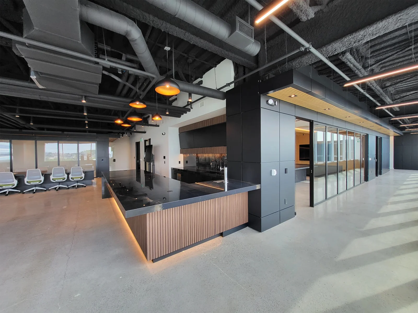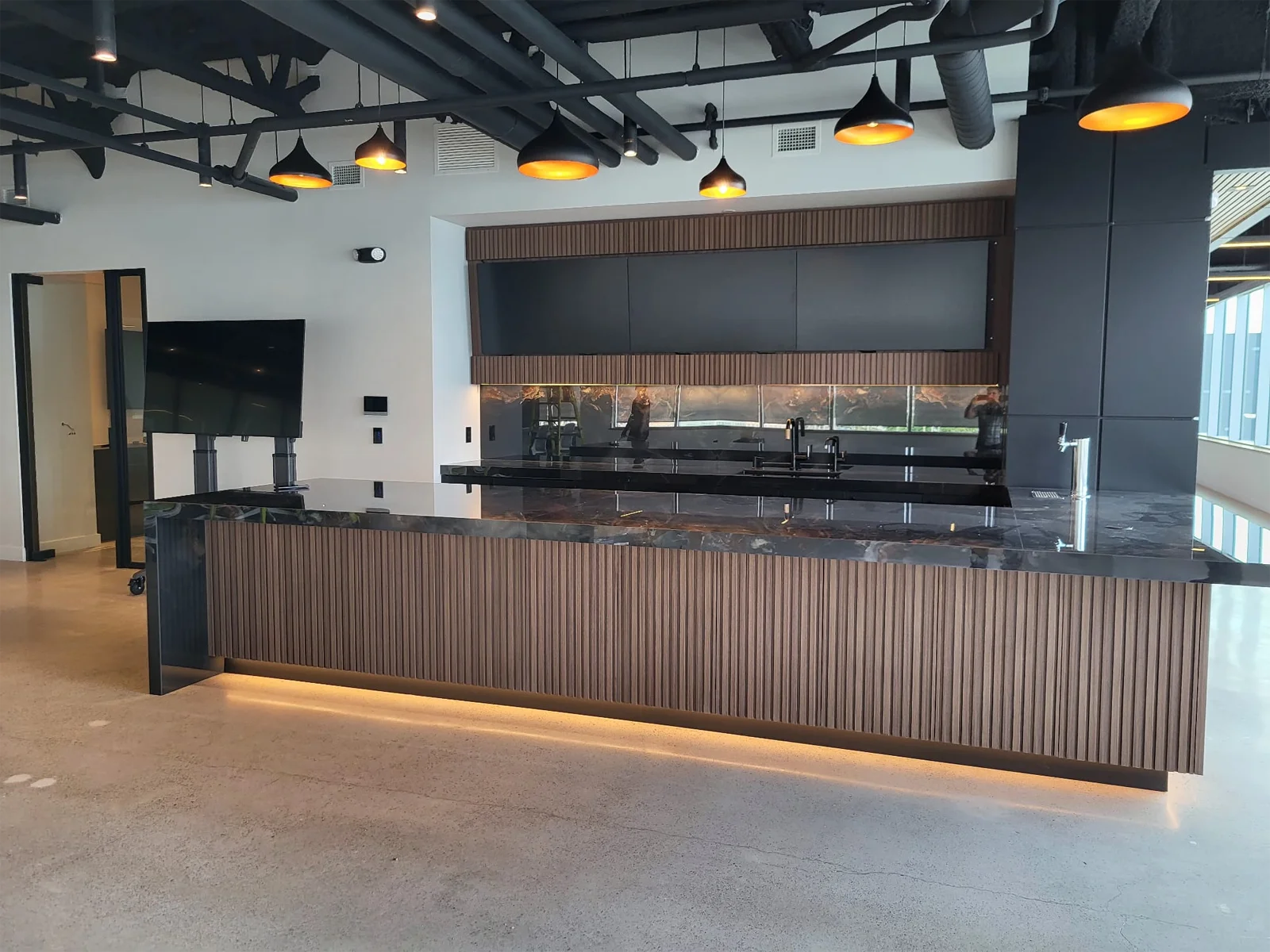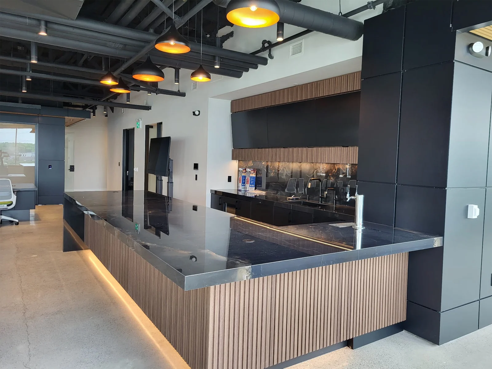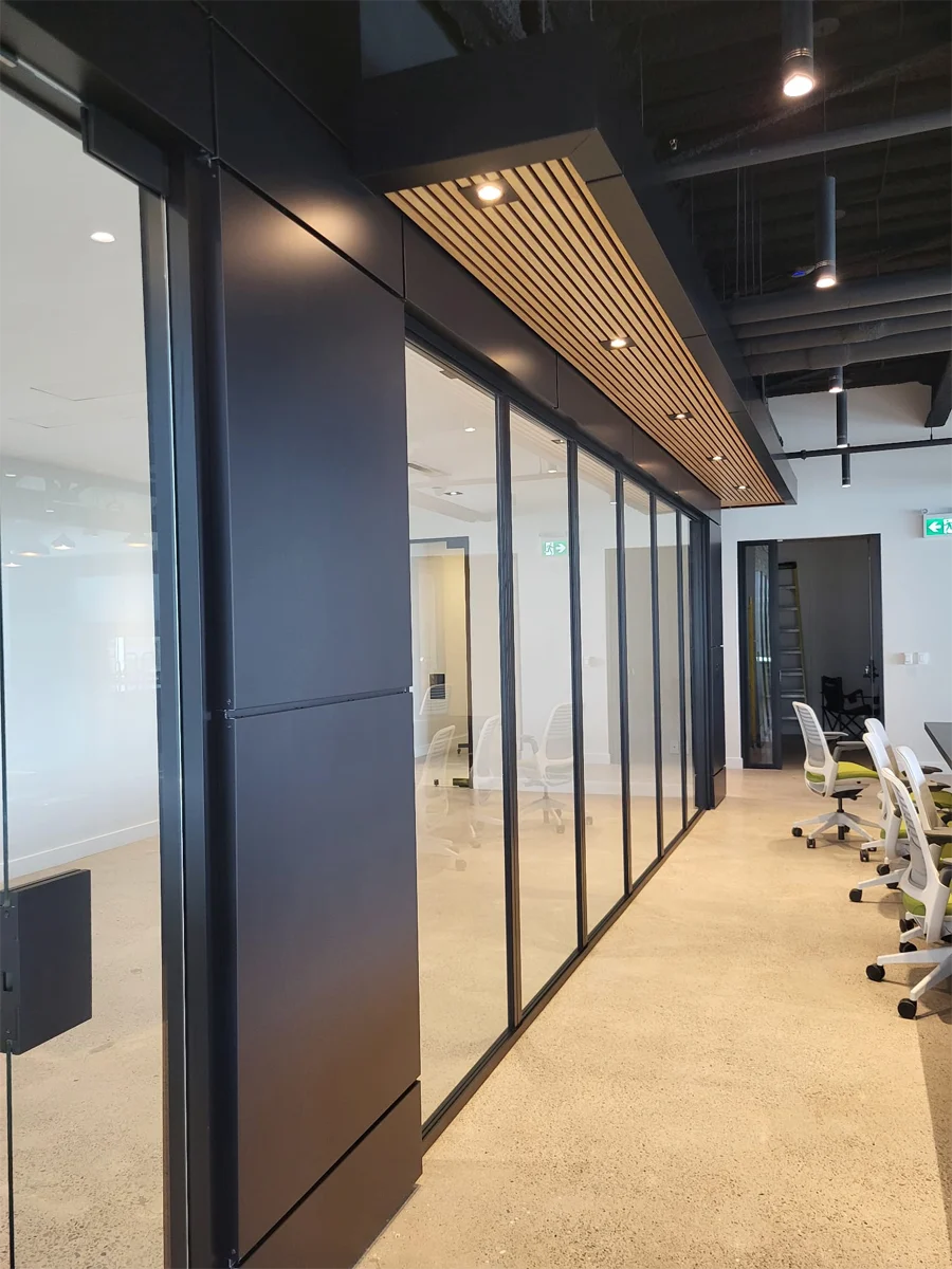 For Chronicle Financial’s corporate headquarters, BuildSky crafted a unified design language across exterior and interior surfaces. The Aluflex ACM panels provide a durable, weather-resistant frame around the building’s façade, while the warm wood-composite soffit adds texture and visual interest beneath the canopy. Inside, a feature wall in black ACM cladding incorporates a backlit cut-out of the Chronicle logo, creating a high-impact lobby focal point.