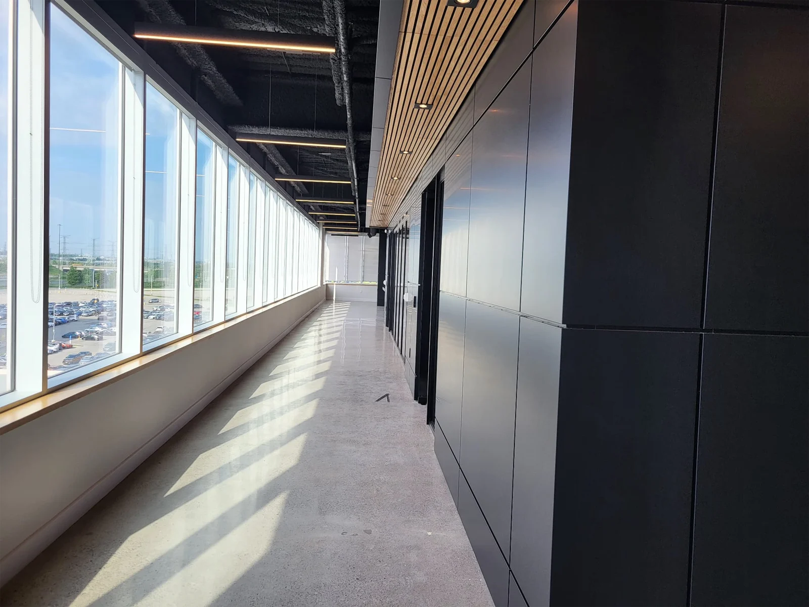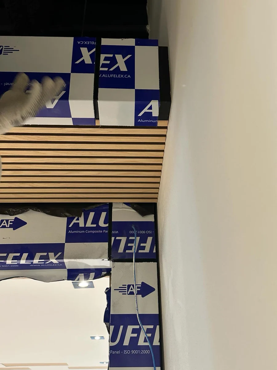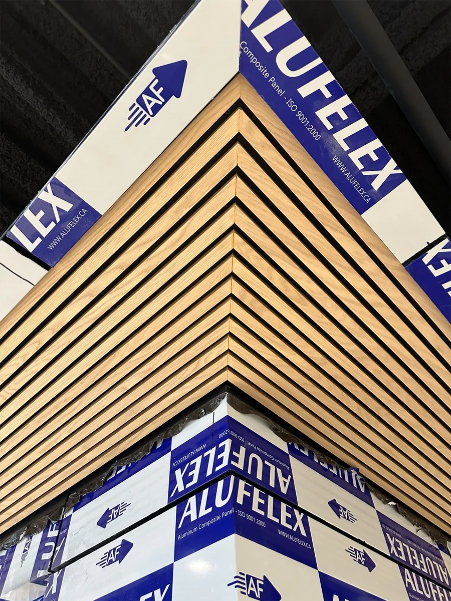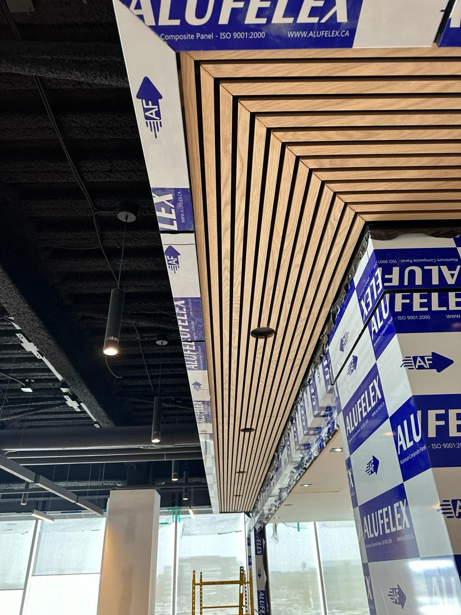 - Services Provided: Façade consultation & 3D renderings • Aluflex ACM procurement • Wood-composite soffit fabrication • Interior ACM wall installation • Quality assurance & warranty