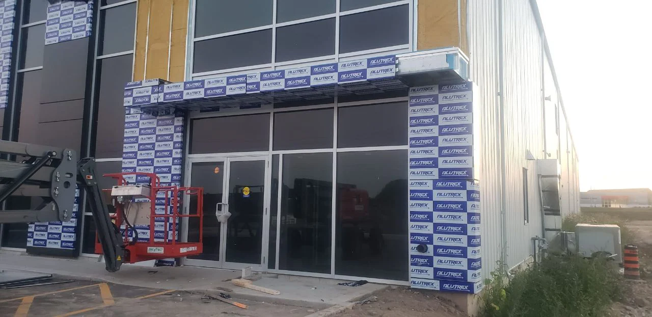 The Griffin Lane Industrial Park in Woodstock, ON, showcases BuildSky’s capability to tackle large-scale industrial and commercial cladding projects. This multi-unit complex features a bold interplay of dark grey ACM panels, white ACM infill, and custom Alutrex soffits, delivering a unified, modern façade along the park’s main thoroughfare.