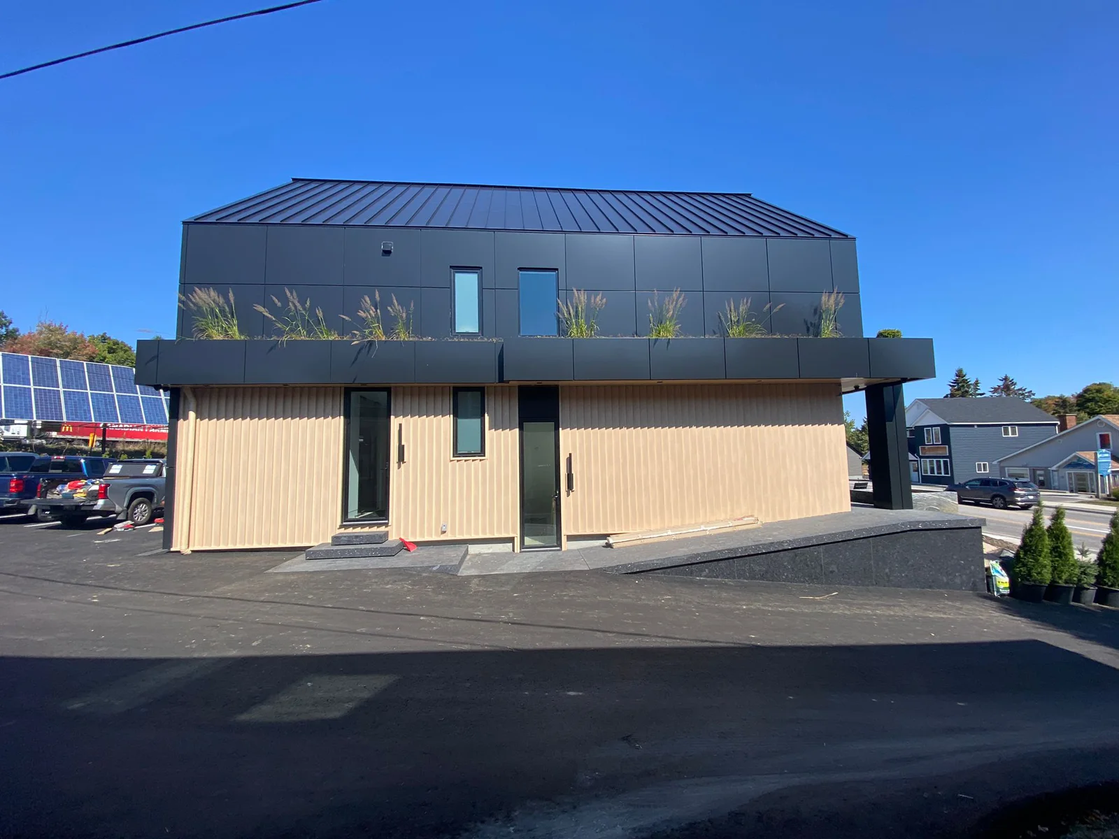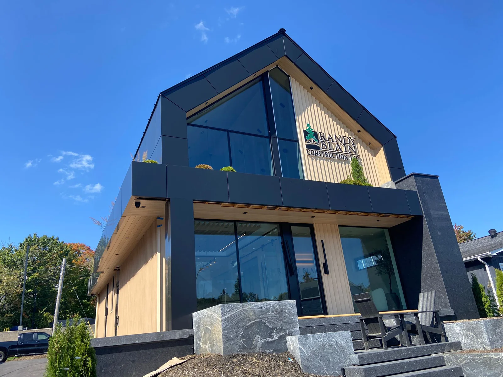 - Black matte ACM panels framing windows, canopy, and gable ends