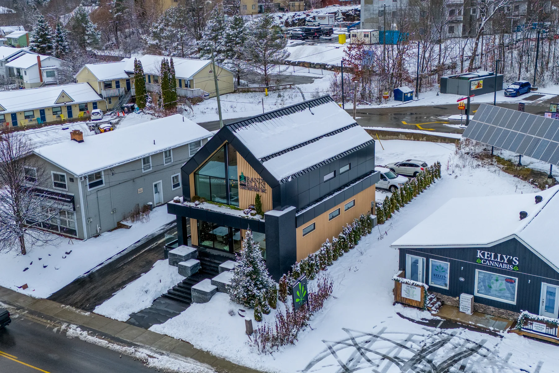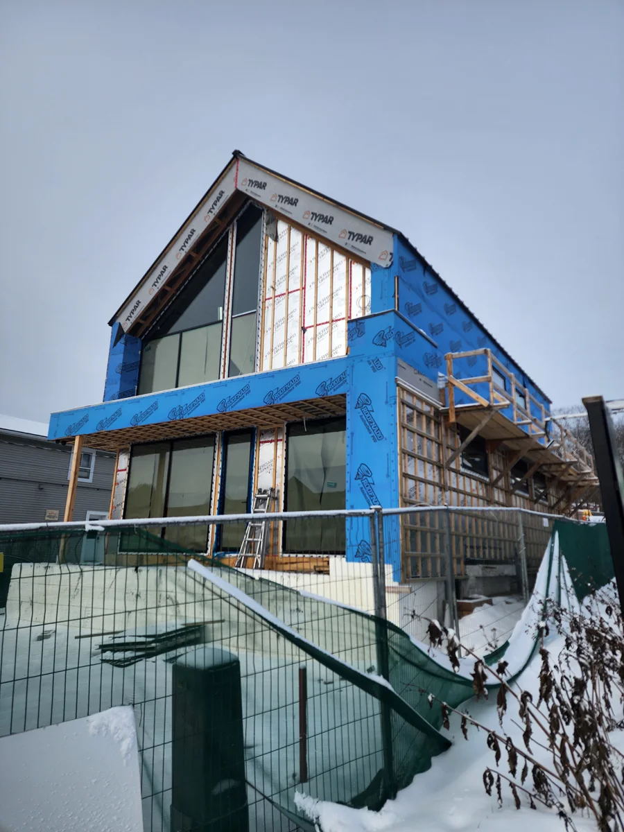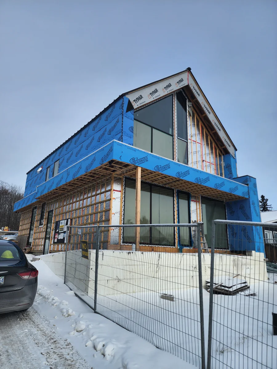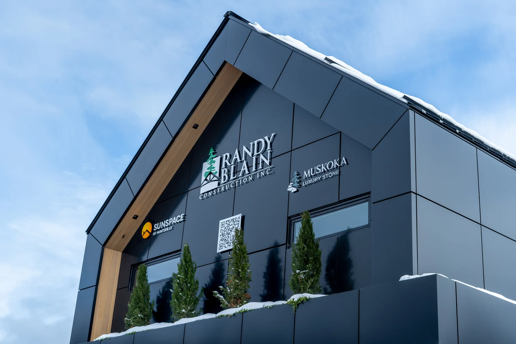 Nestled on King Williams Street in Huntsville, this custom residence for Randy Blain Construction showcases BuildSky’s blend of architectural precision and material innovation. The striking façade combines warm vertical wood-composite slats with bold black ACM cladding panels, creating a modern take on classic Ontario cottage style.