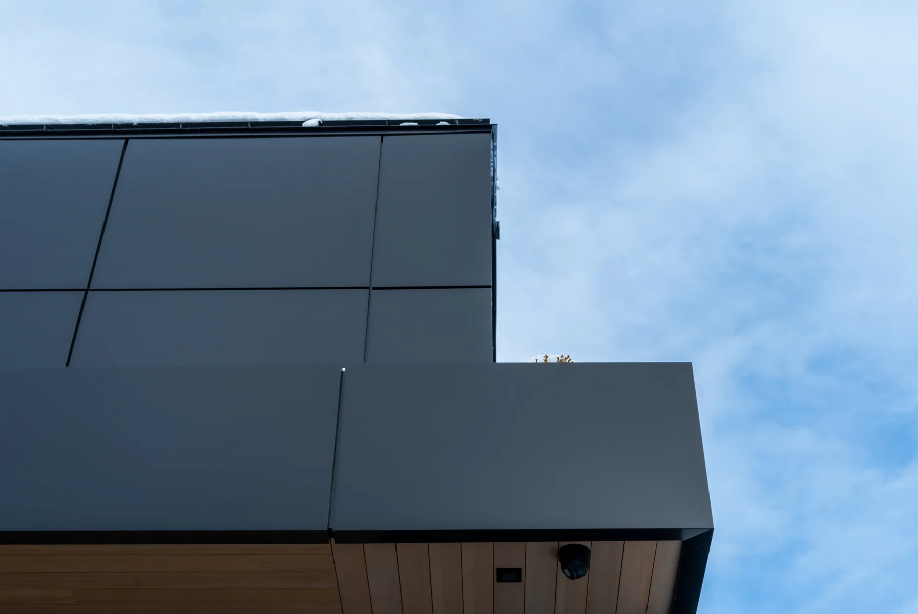 For this lakeside-inspired design, BuildSky partnered with Randy Blain Construction to modernize a traditional cottage form. Vertical wood-composite slats bring natural warmth and texture across the upper gable, while the black ACM panels provide crisp geometry around the large glazing and entry canopy. Beneath the covered porch, ACM soffit panels ensure a clean, weatherproof ceiling that ties the entire look together.