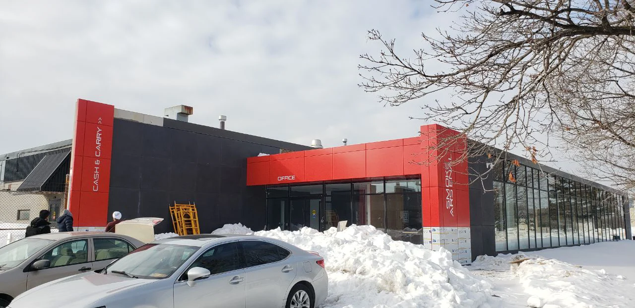 This Smoke Arsenal Cash & Carry facility in Etobicoke, ON, showcases BuildSky’s expertise in commercial cladding with a bold application of red ACM panels and charcoal composite cladding. Designed for B2B distribution of vaping products and smoking accessories, the façade delivers both brand impact and exceptional durability.