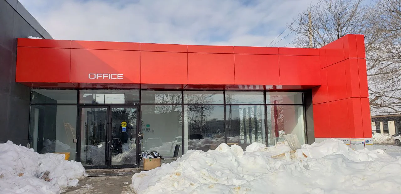 BuildSky partnered with Smoke Arsenal to create a high-impact commercial façade that reflects the brand’s energetic red-and-black identity. The red ACM panels frame the main “Office” entrance, guiding B2B clients inside, while the charcoal composite panels offer a sleek, professional backdrop. Under the overhang, concealed-fastener ACM soffit panels provide a clean, weatherproof finish.