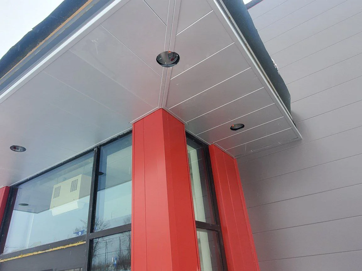 This Wendy’s restaurant commercial cladding project in Hamilton’s Upper Centennial neighborhood features a dynamic blend of silver aluminum composite panels (ACM cladding), wood-tone composite cladding, and vibrant red ACM accents. BuildSky delivered a full-service commercial cladding solution—from 3D façade design and material selection to precision fabrication and expert installation—creating a modern exterior that stands out in Hamilton’s fast-food corridor.